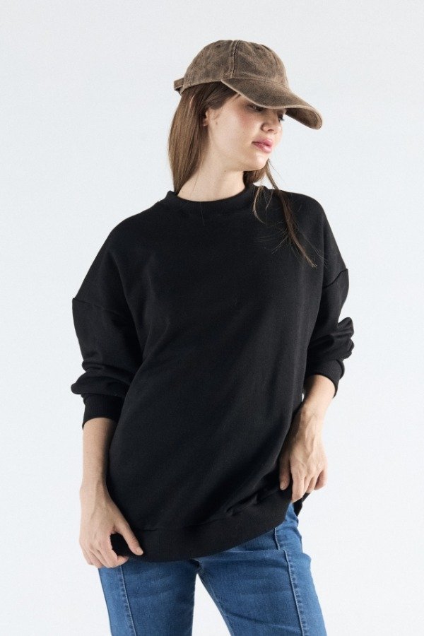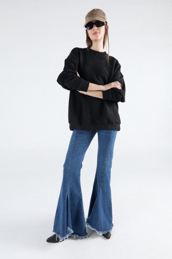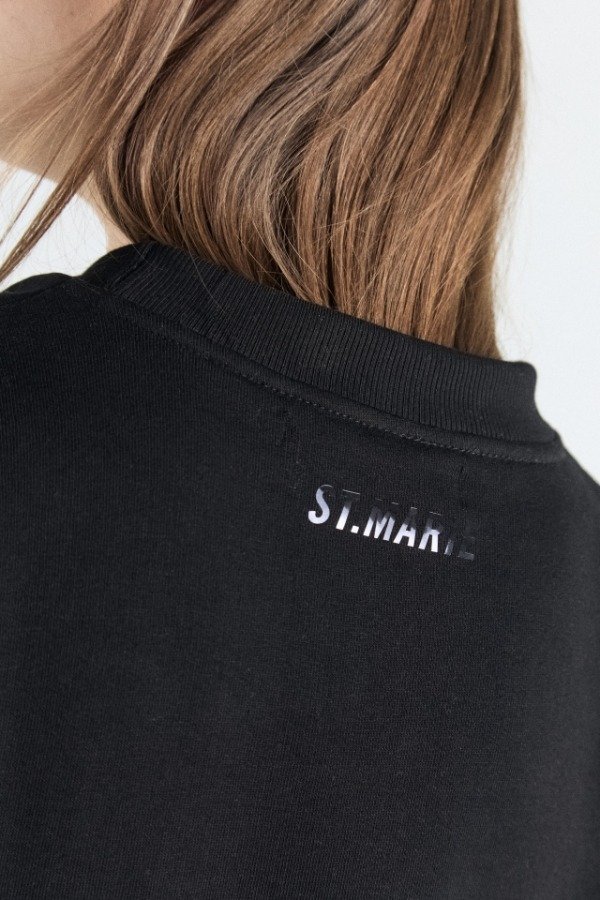 Buzo de rustico calce oversize con cuello redondo, detalle de estampa holografica en espalda.