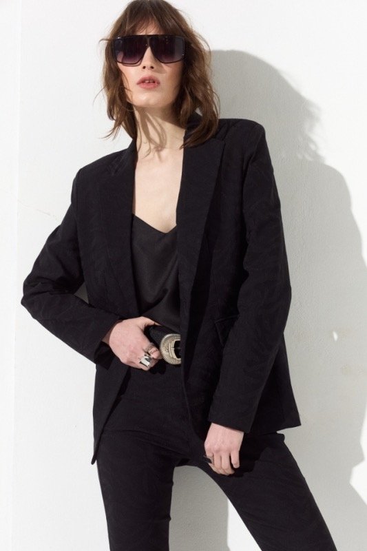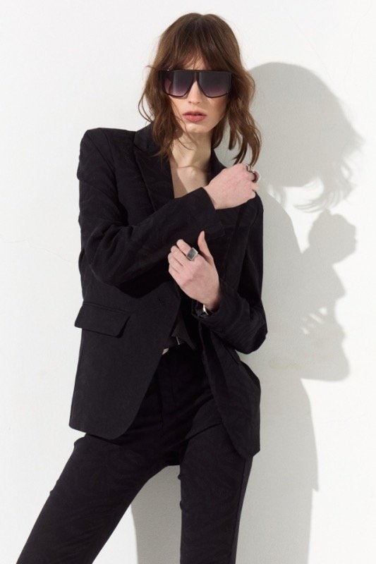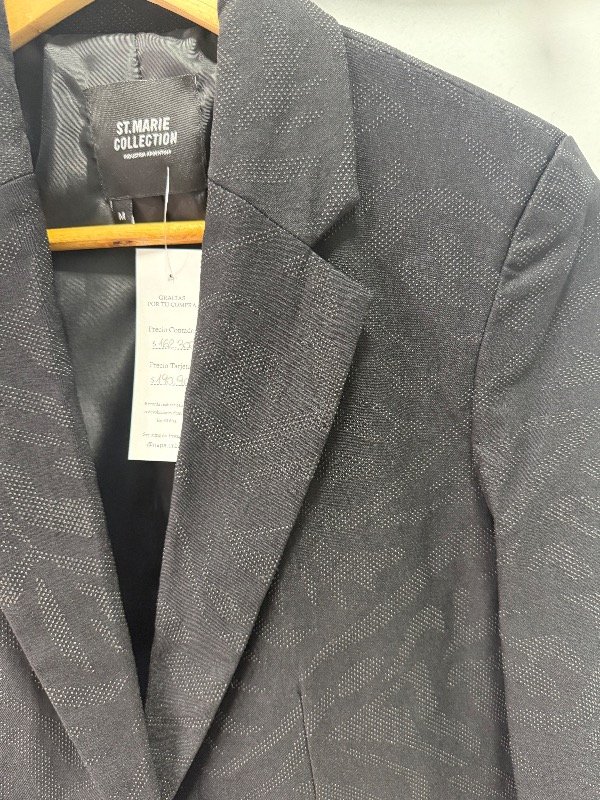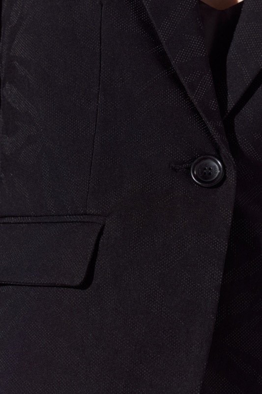 Blazer de Bengalina texturizada el delantero lleva dos pinzas de entalle que culminan en bolsillos los mismos tienen tapa y no son decorativos