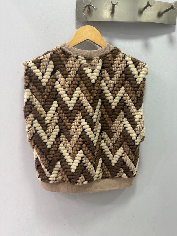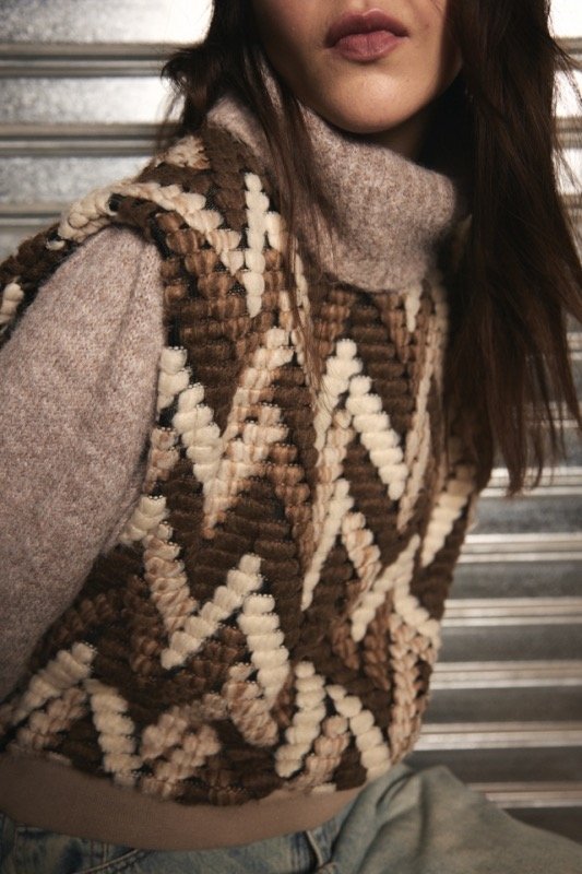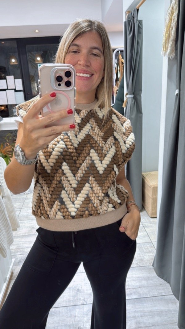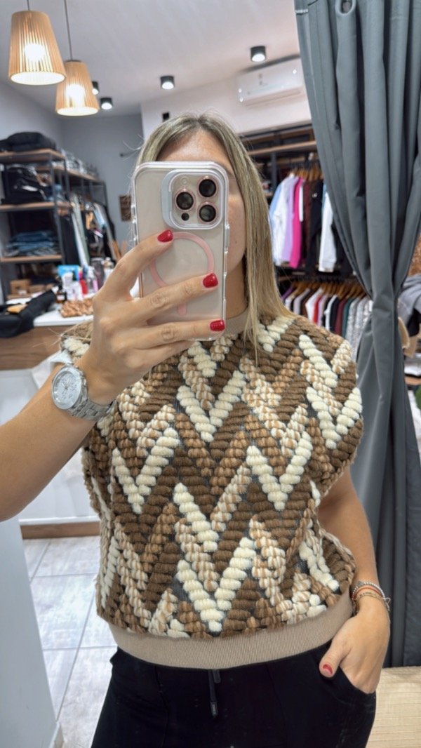Chaleco con textura simil punto lana cuello a la base y badana de PU en espalda