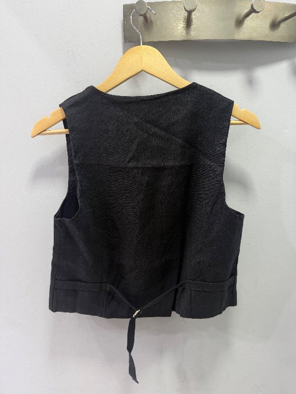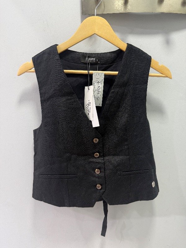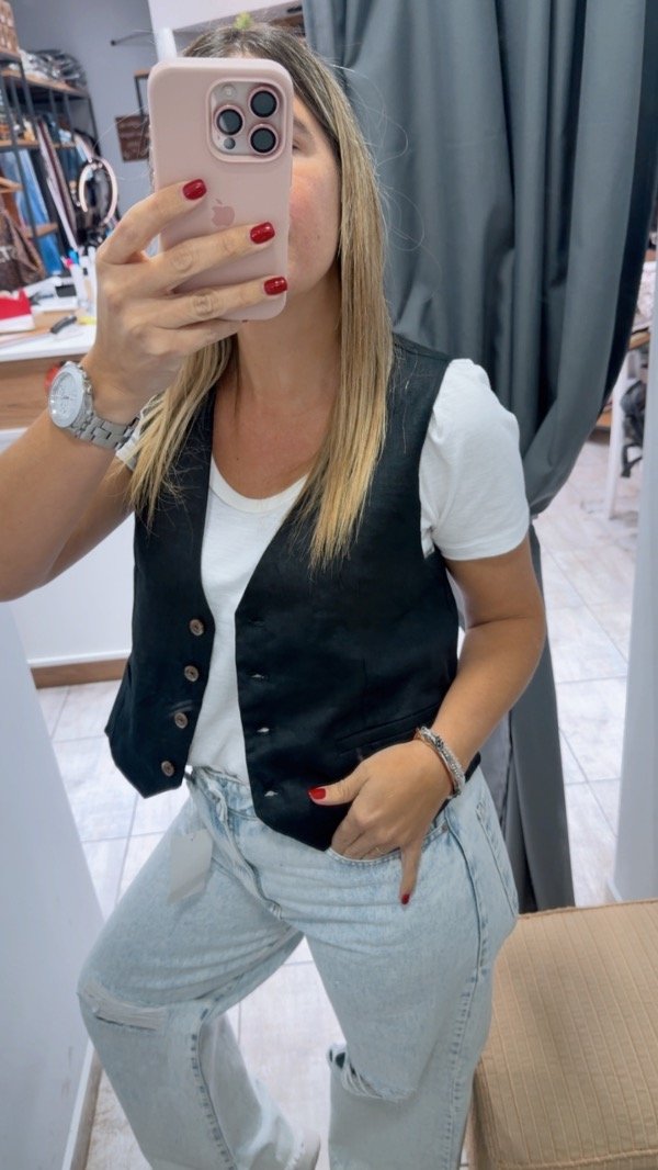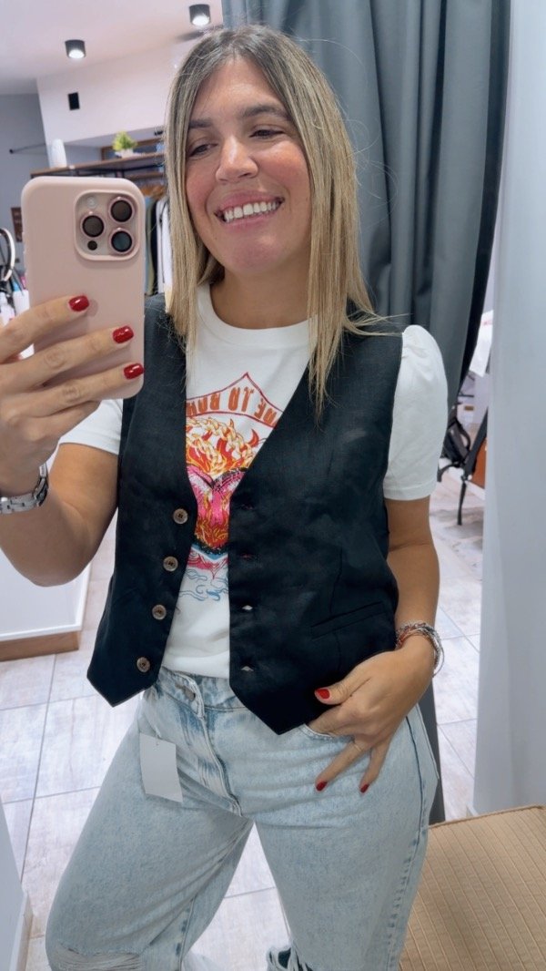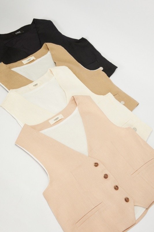 Chaleco sastrero confeccionado en lino posee dos pinzas de entalle que culminan en bolsillos ojal