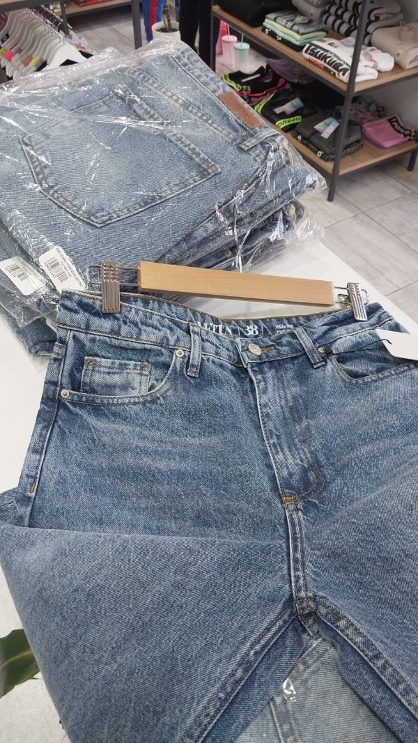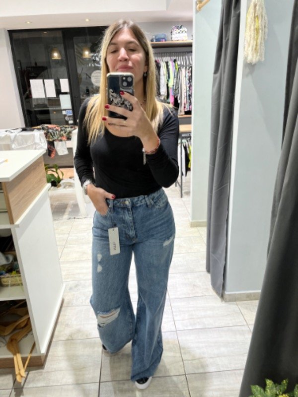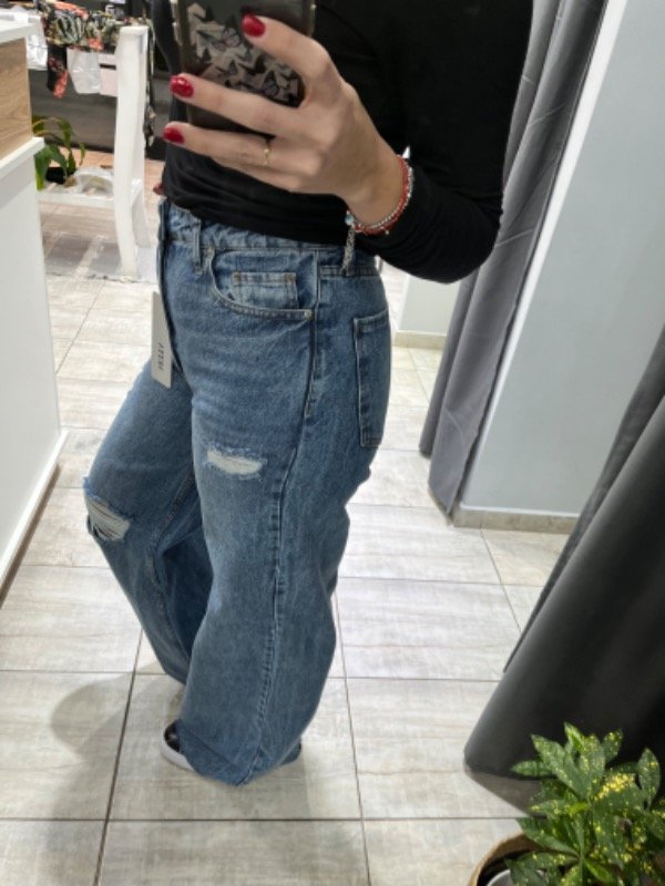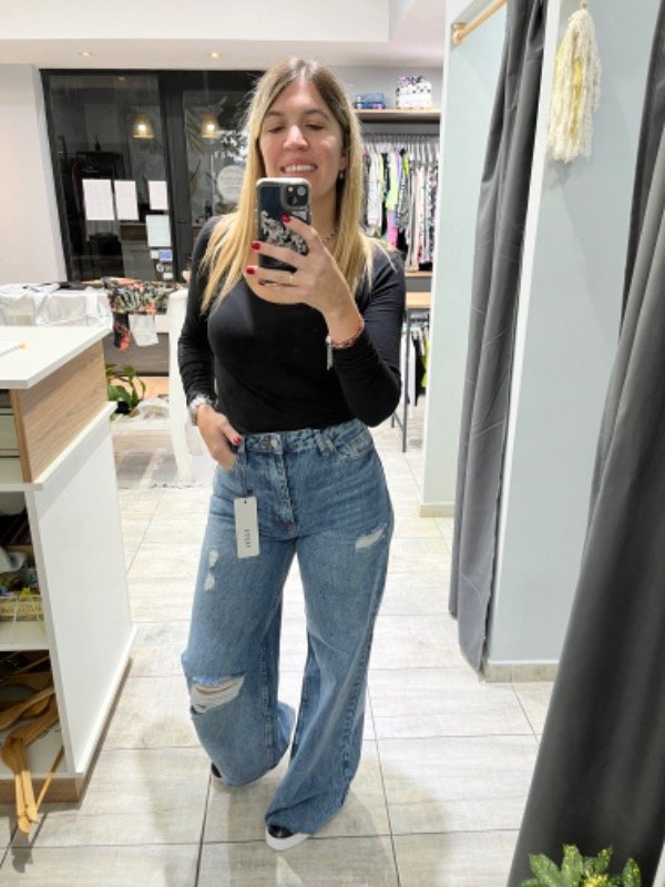 Jean tiro alto rígido con roturas y ruedo desflecado.