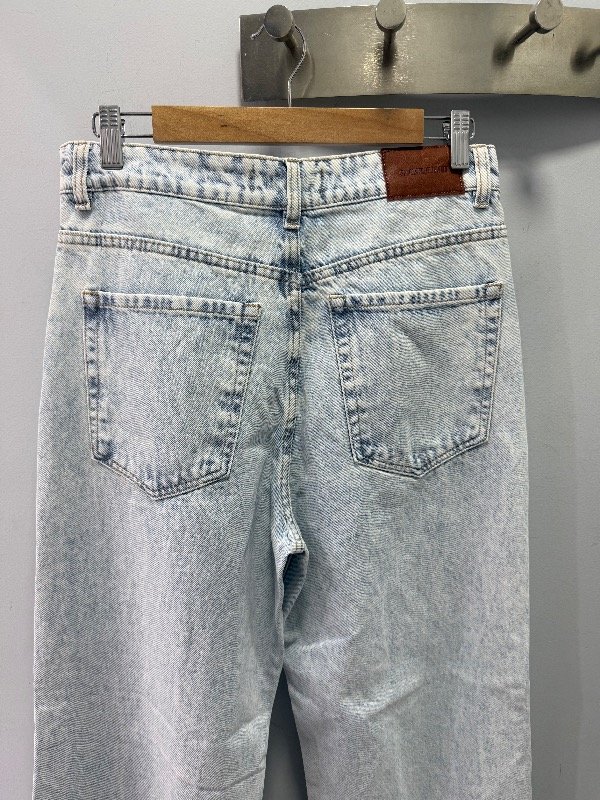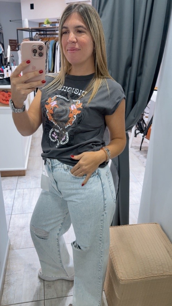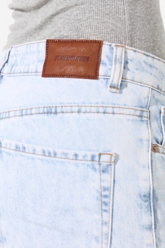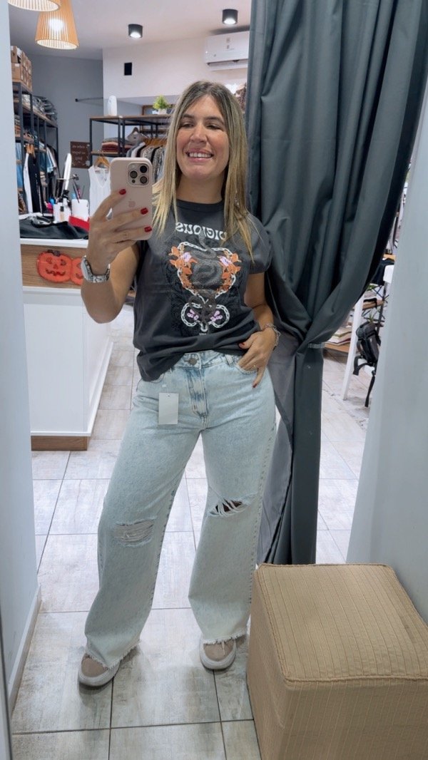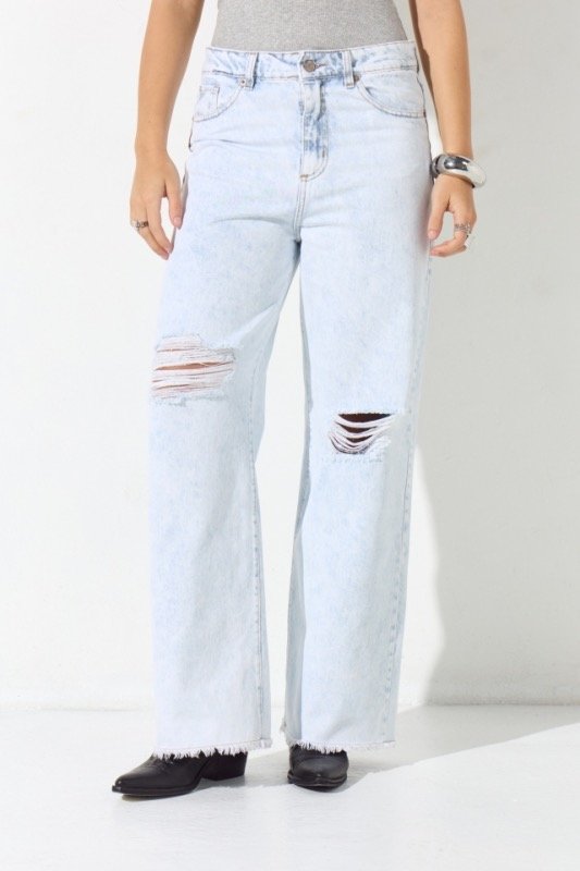 Jean tiro alto pierna holgada y cinco bolsillos su largo es hasta el talón tiene un lavado índigo claro y desflecado en ruedo