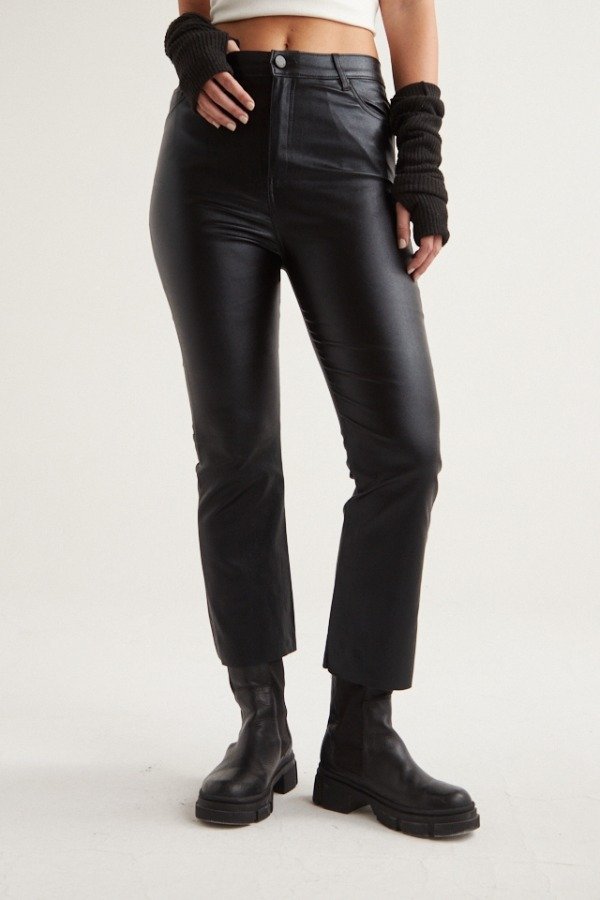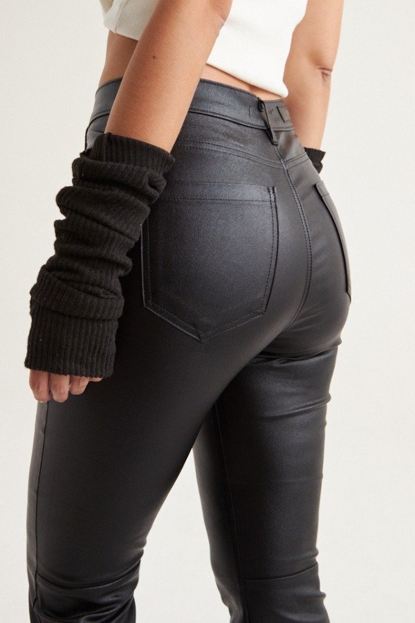 Pantalón metalizado elastizado de corte jeanero cropped Leg, con badana en espalda. Composición: 100 % PU.