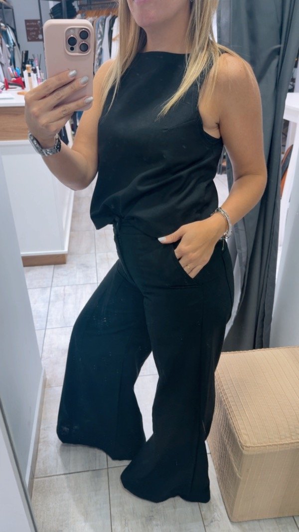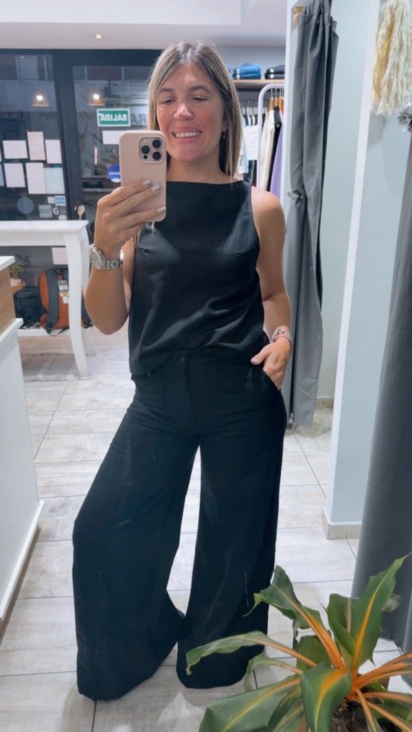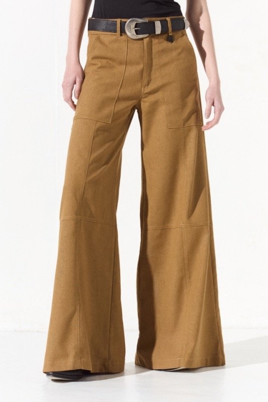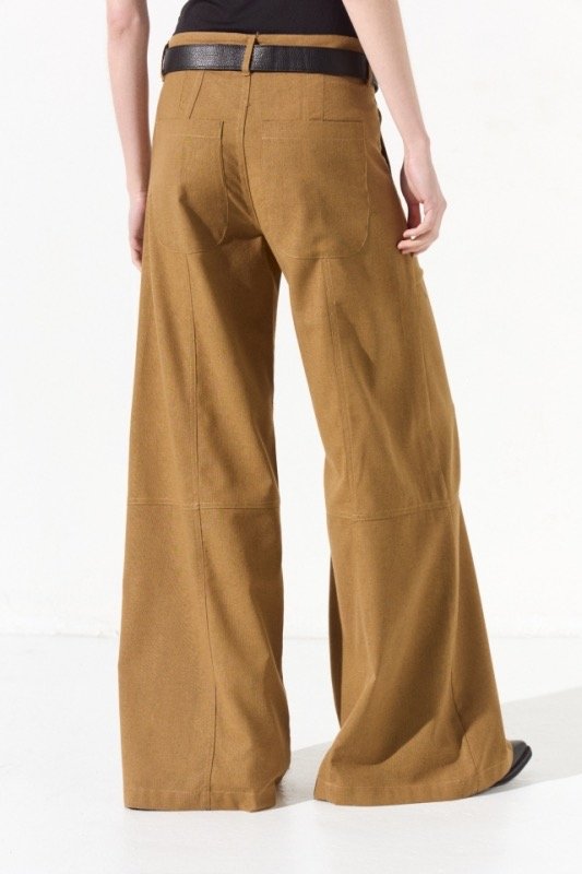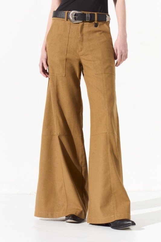 Pantalón de lino cintura ancha y botamanga ancha con recortes y bolsillos superpuestos