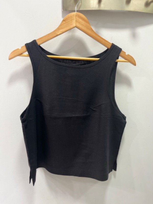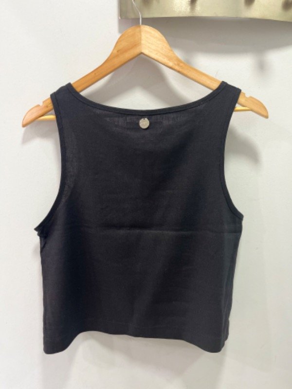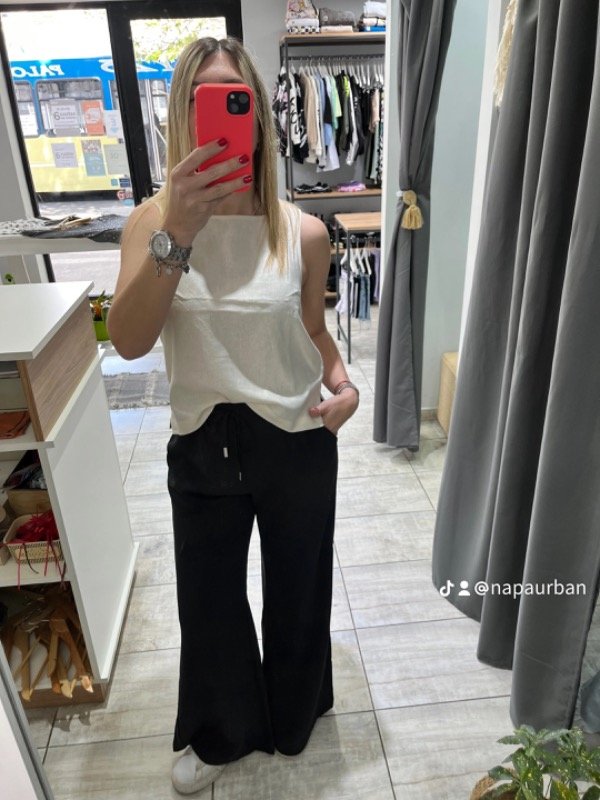 Musculosa de lino cuello cerrado con pinzas en delantero y detalle de chapita en espalda.