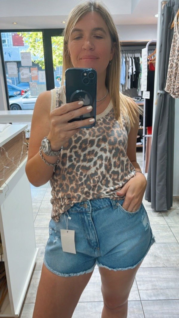 Musculosa viscosa flame estampado con tira de lurex en escote.