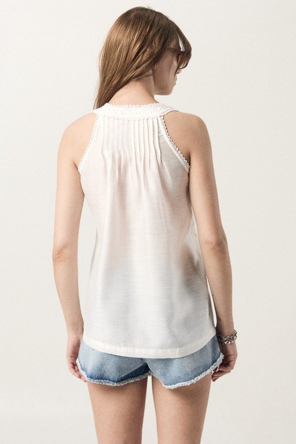 Musculosa de voile con detalle de alforzas y bordado en delantero