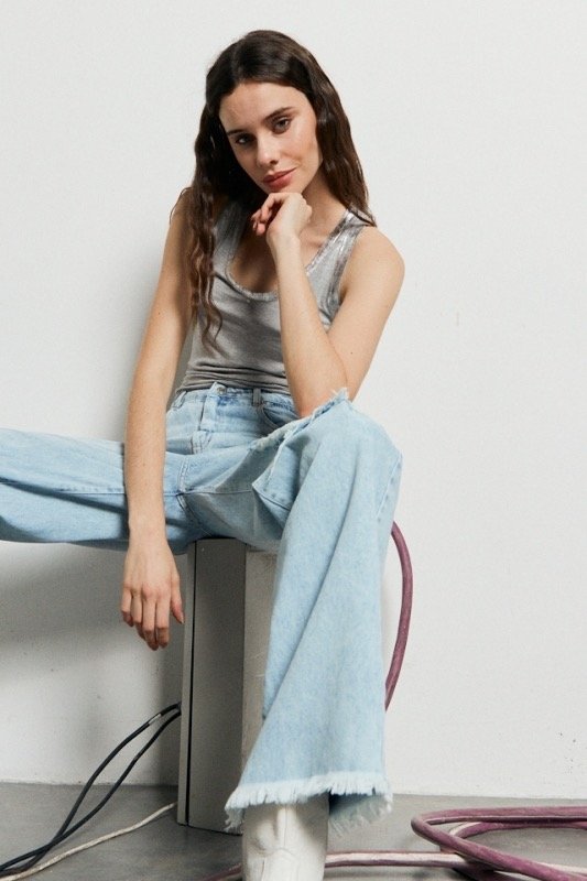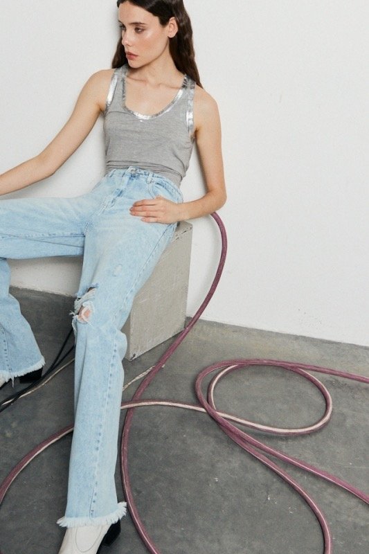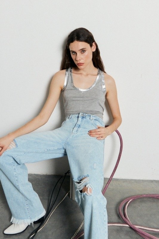Musculosa de jersey con detalle metalizado en sisa más larga atrás.