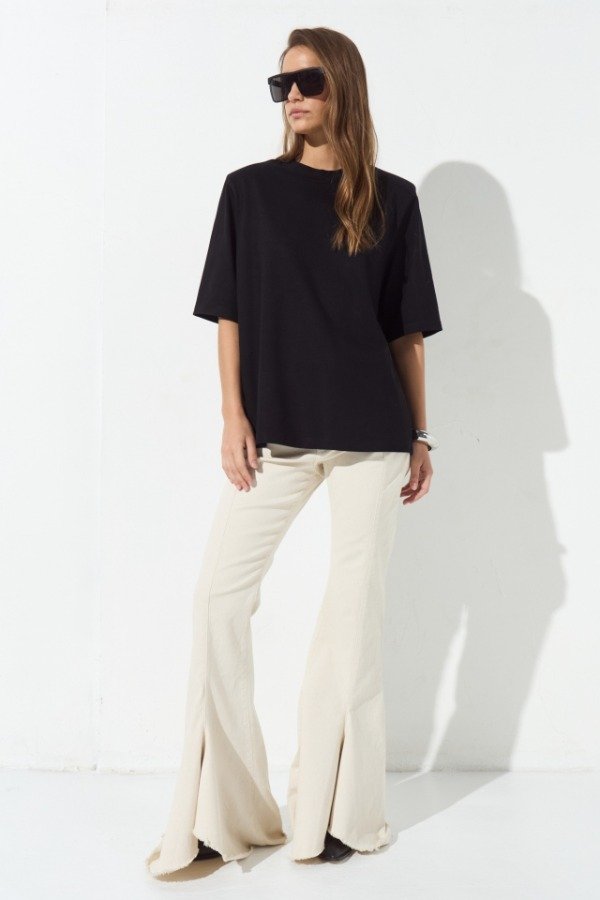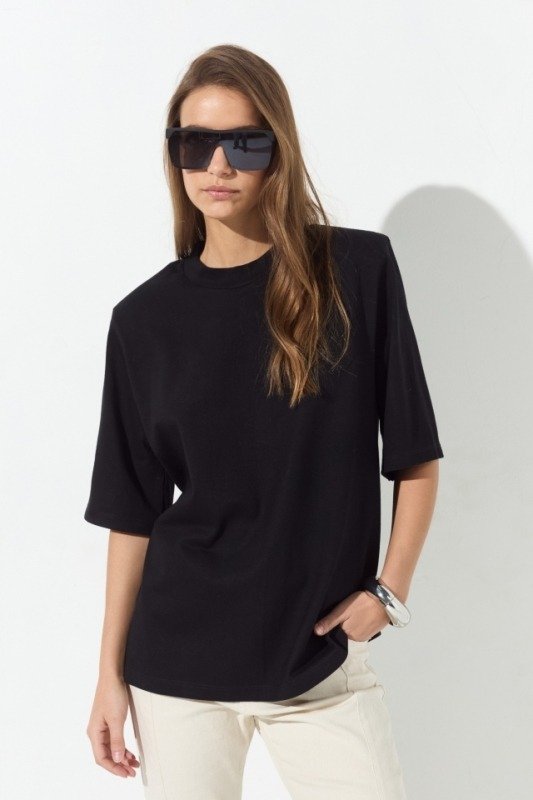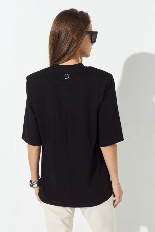 Remera confeccionada en jersey, de calce relajado con hombreras y escote a la base.