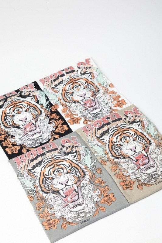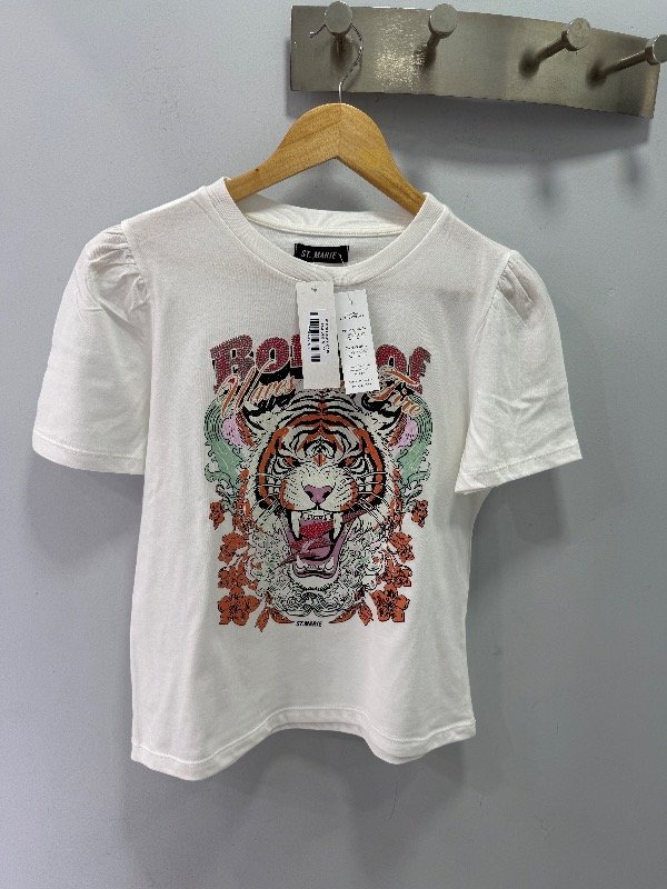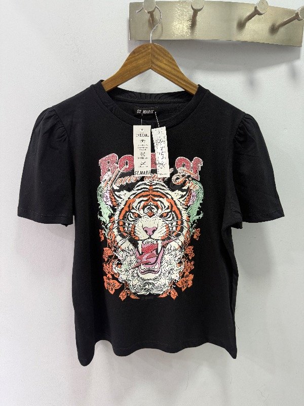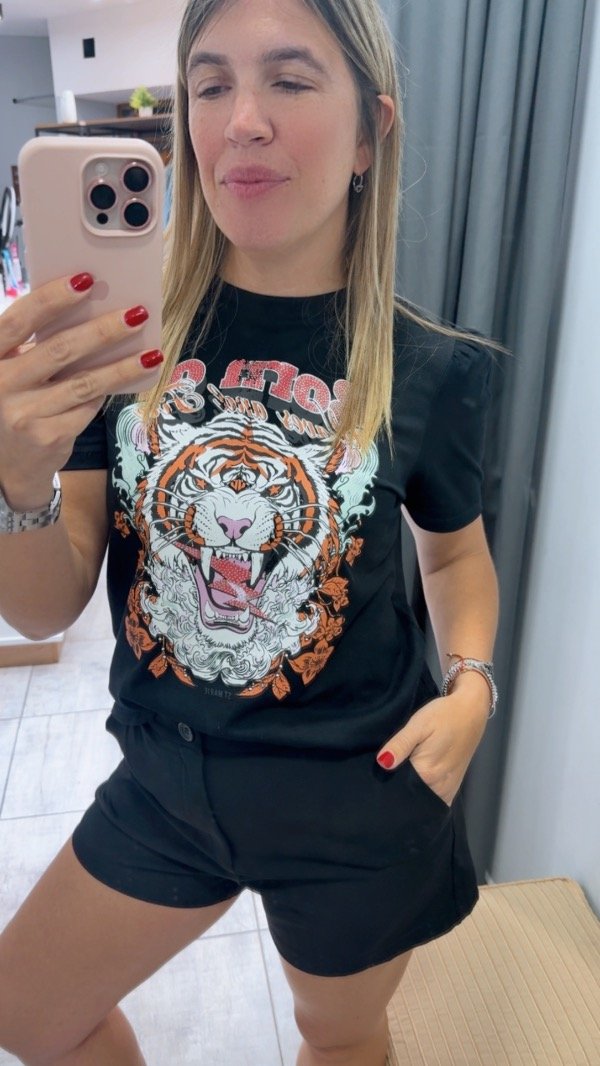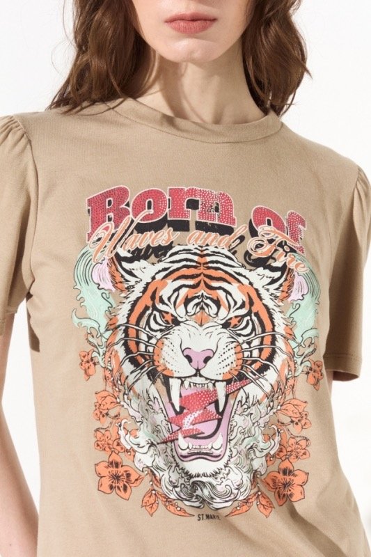 Remera estampada escote redondo en las mangas tiene frunce y en el centro espalda grifa con marca