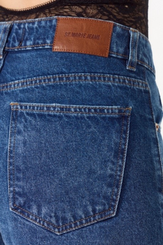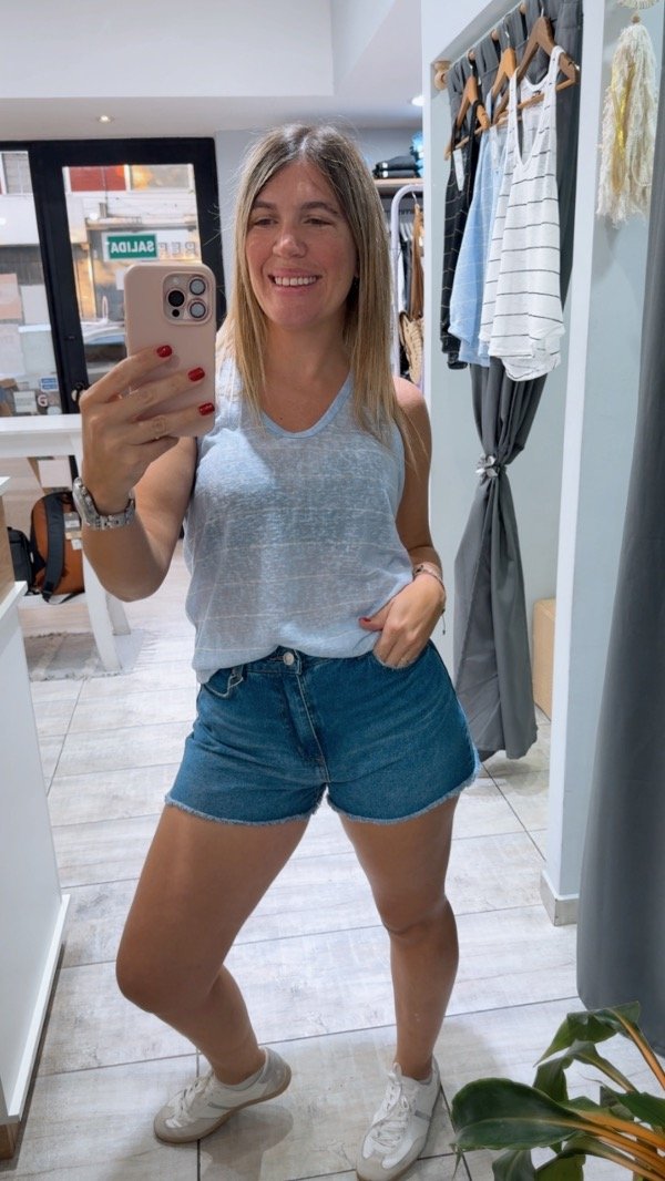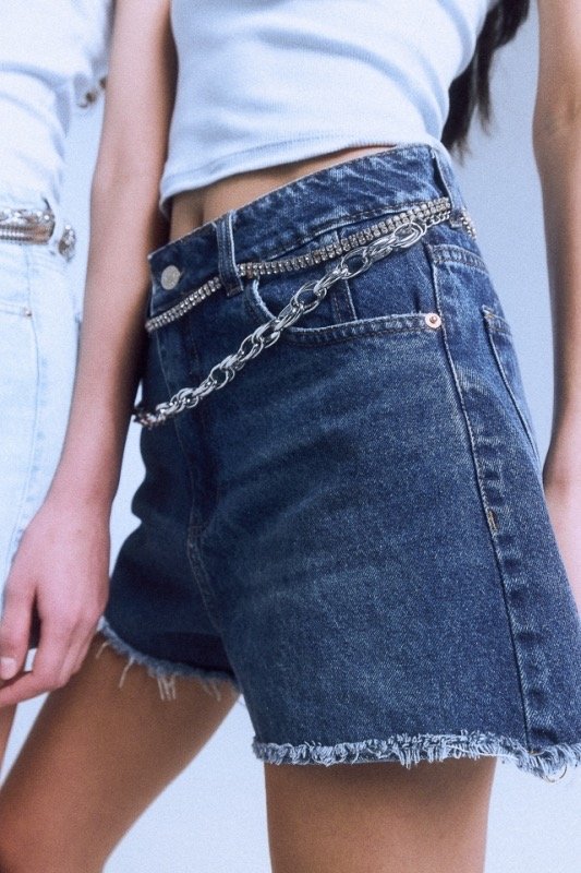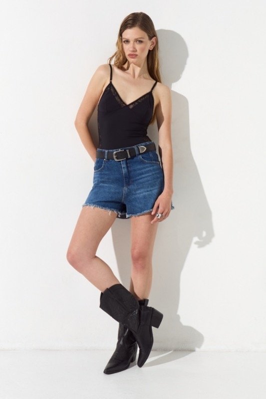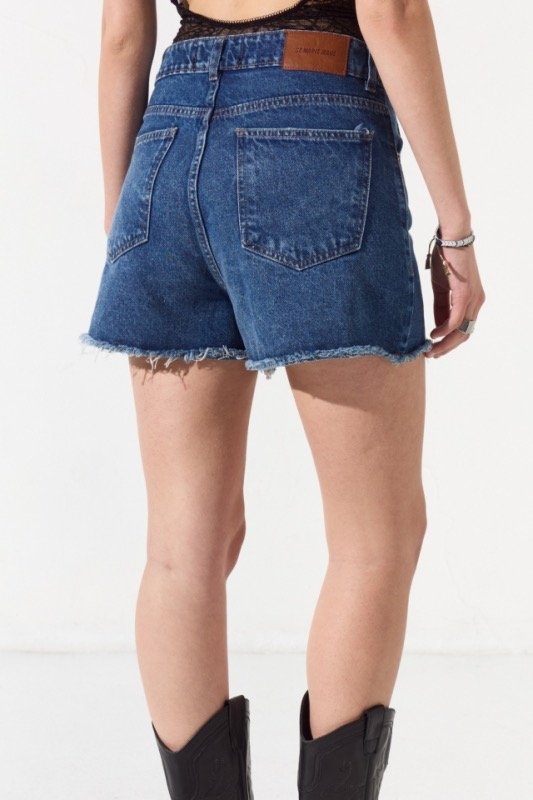 Short de Jean con calce relajado tiro alto posee cinco bolsillos y su ruedo es desflecado
